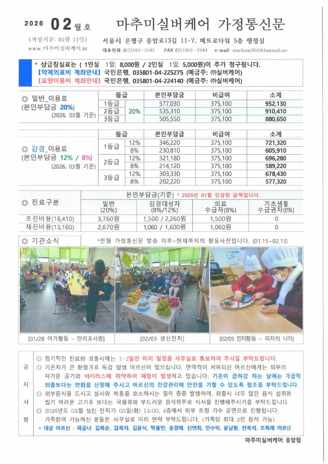 02월 가정통신문을 올려드립니다. 매달 요양원에서 진행한 프로그램과 행사 알림사항이 게재되어 있으니 참조하시기 바랍니다. |